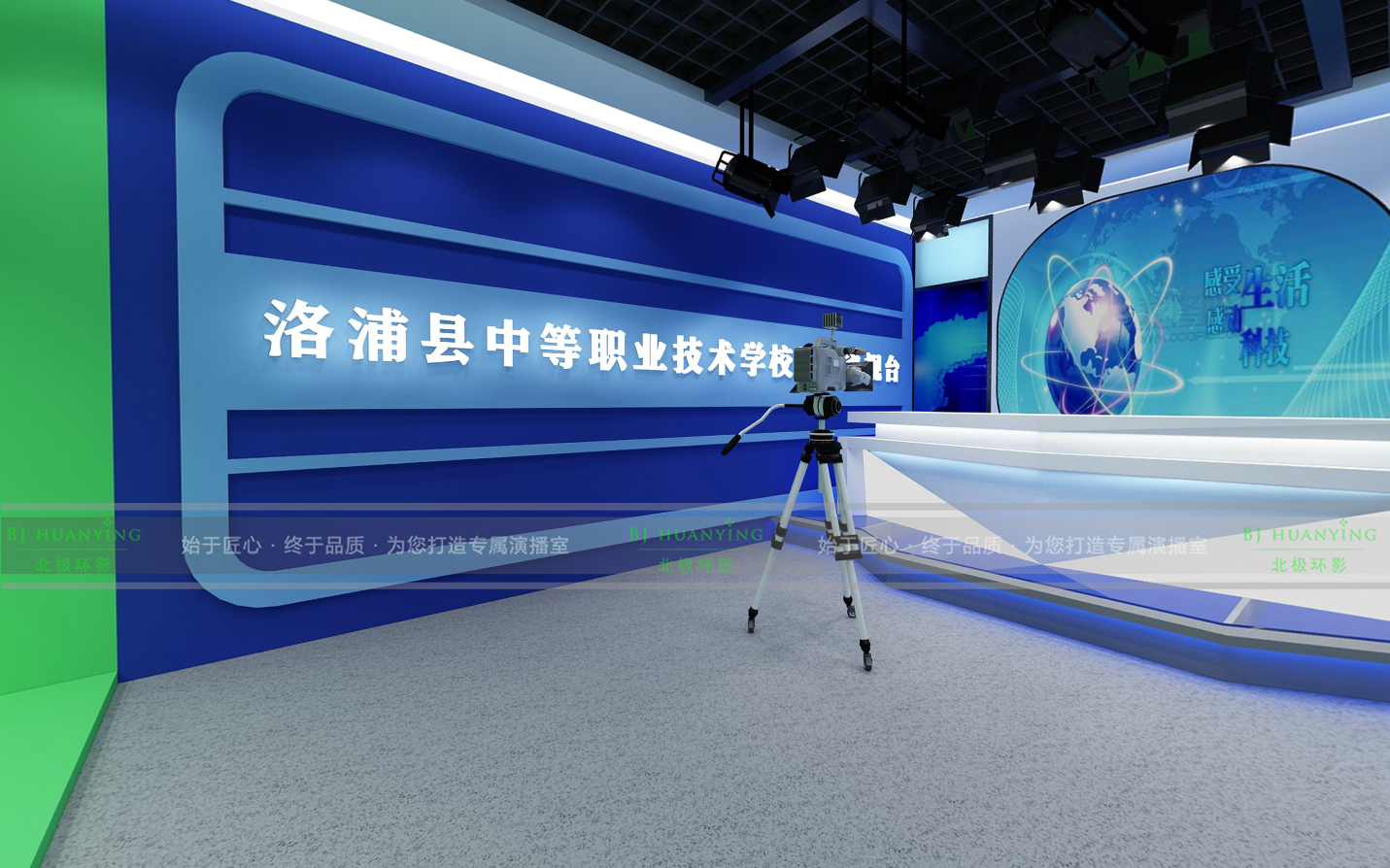整个演播室按功能划分为虚拟演播区、实景座谈区、“校园访谈”栏目区、控制室。该校园电视台设计是集新闻制作、电视访谈、个人演讲、微课制作等节目为一体的专业类综合校园电视台。校园电视台的技术先进性、安全性和环境美学三大要素的整合统一,是该项目整体建设过程中优先考虑的因素;同时兼顾性能价格比,基于上述思考,新疆洛浦中等职业学校精品校园电视台应运而生。该项目占地面积140平米,施工周期30天。