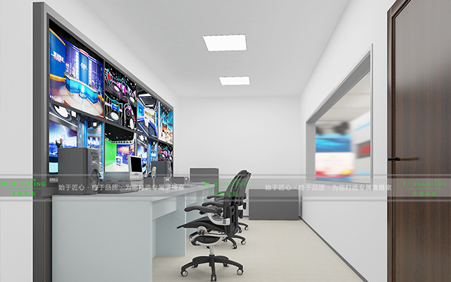 声学系统:演播室装修四周墙面采用吸声材料结构布局,地面布置吸音地毯或地胶板。控制室采用隔断砖混或轻钢结构,为防设备静电,控制室地面采用瓷面防静电地板铺设,美观安全,演播室采用木质防火隔音门。