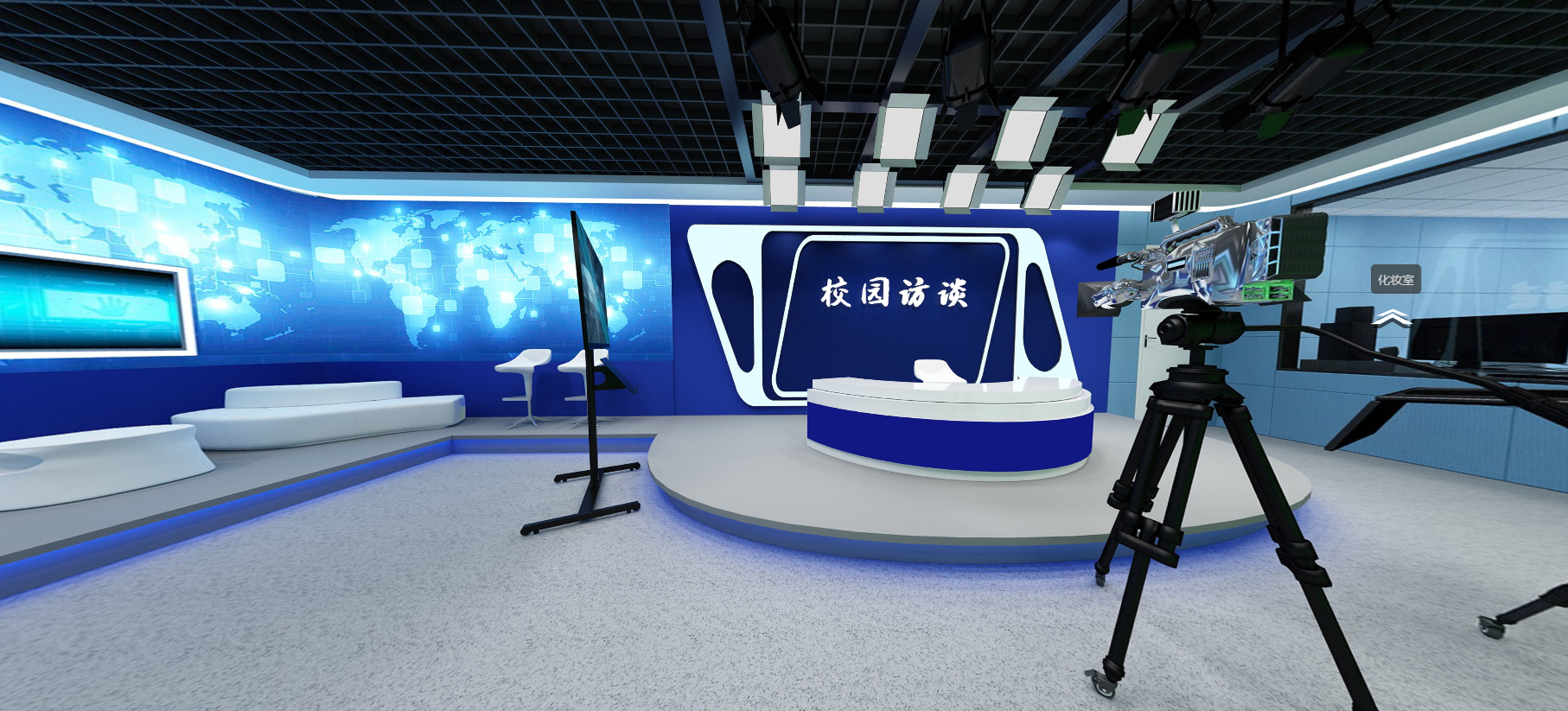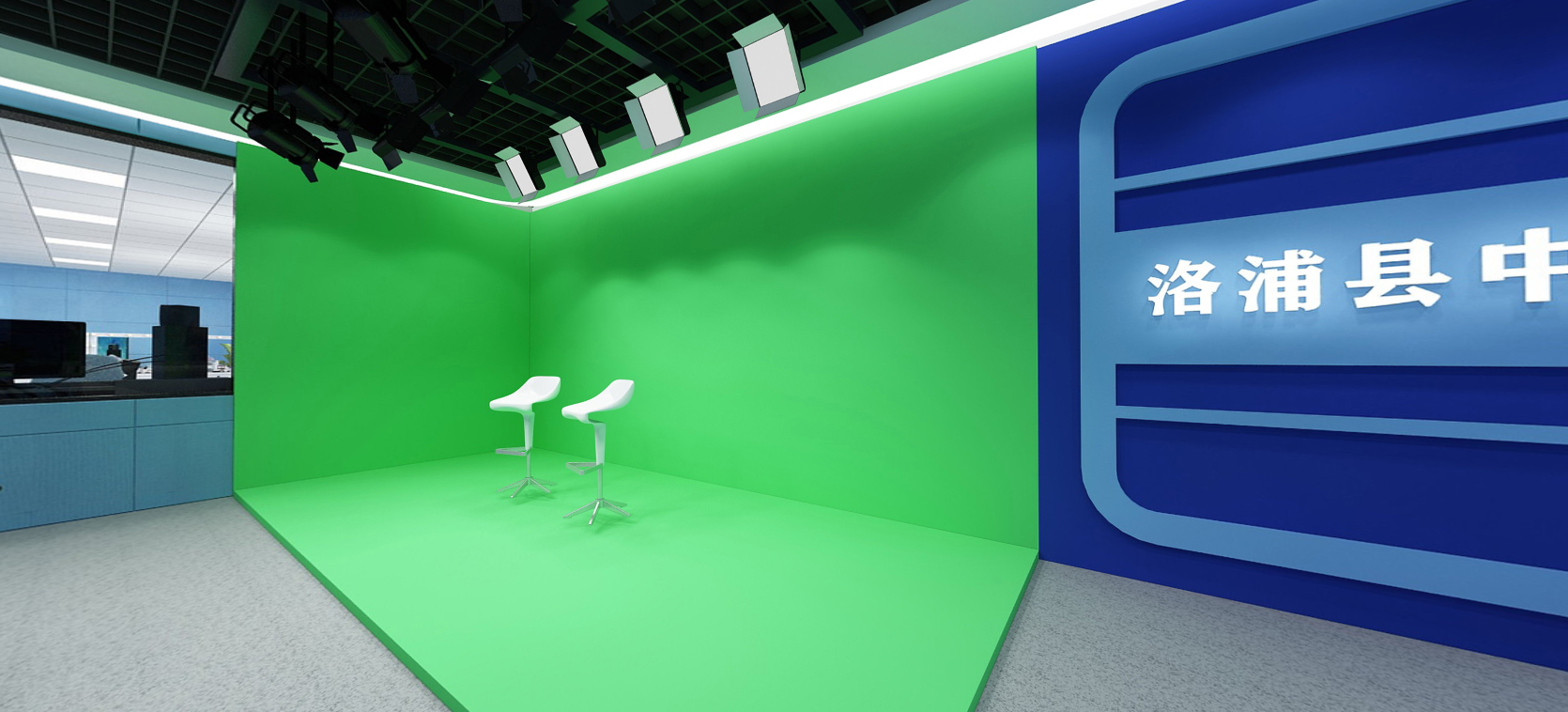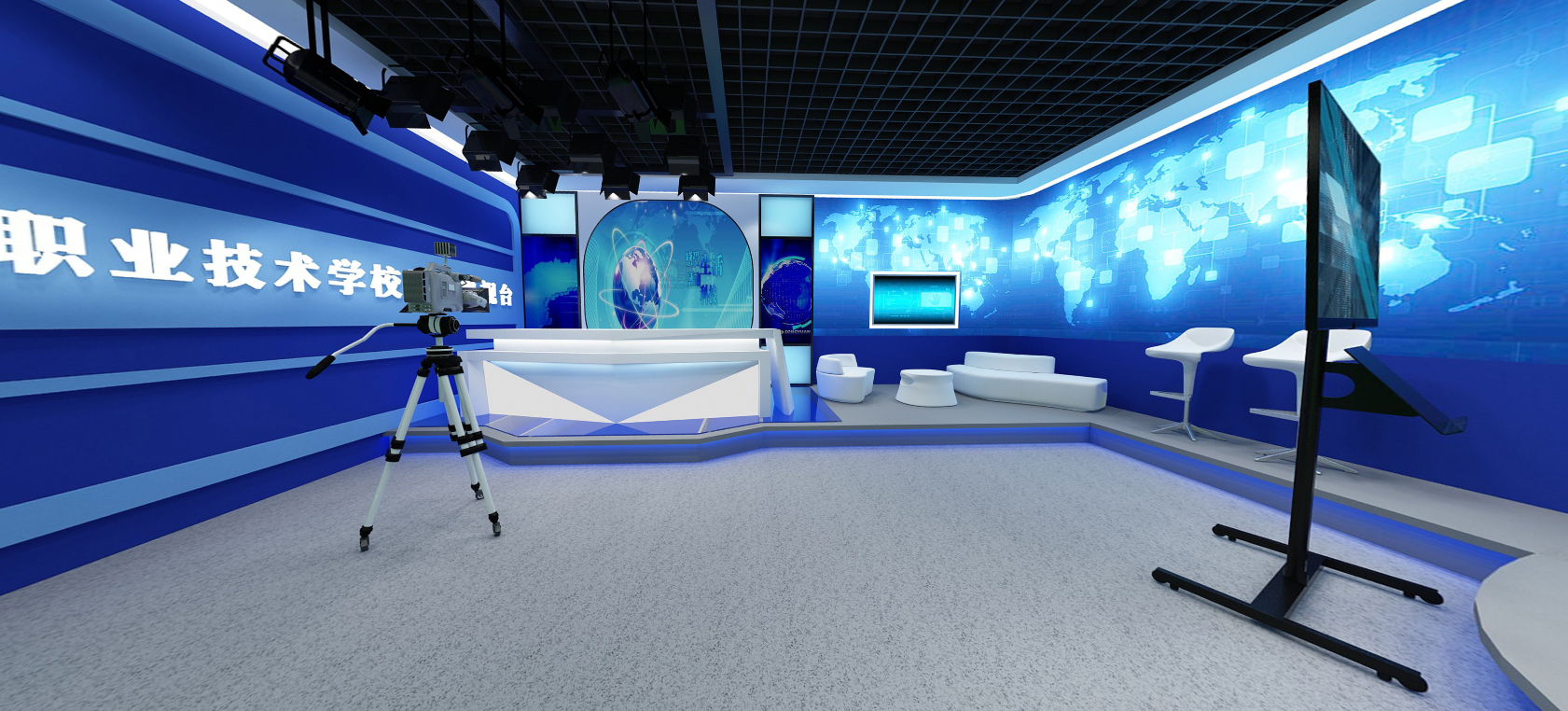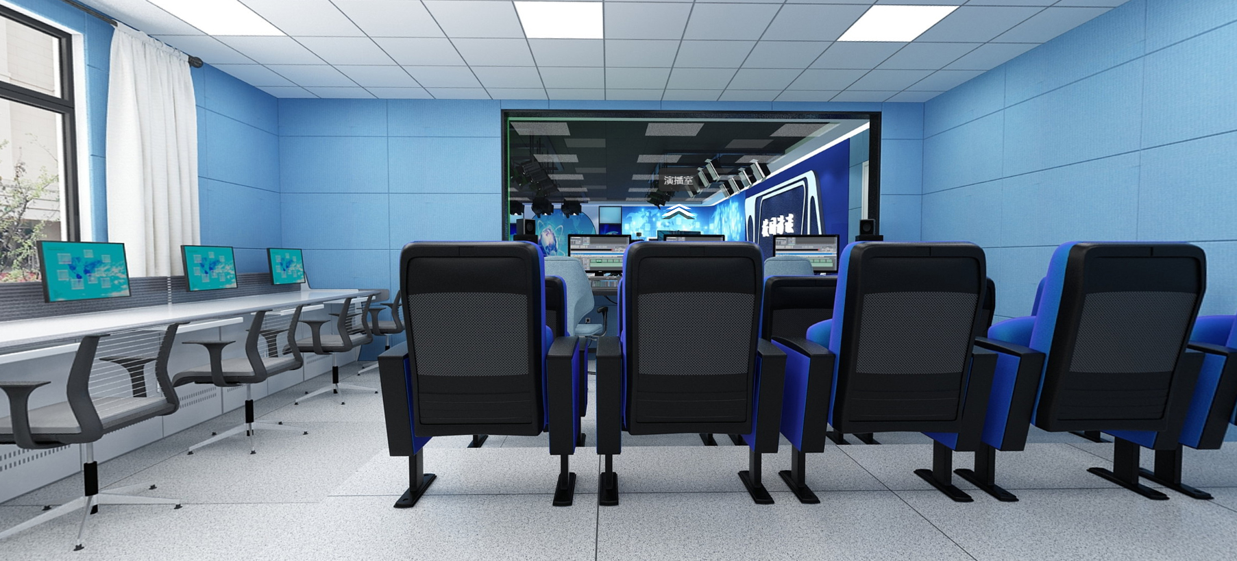 声学系统:演播室装修四周墙面采用吸声材料结构布局,地面布置吸音地毯或地胶板。控制室采用隔断砖混或轻钢结构,为防设备静电,控制室地面采用瓷面防静电地板铺设,美观安全,演播室采用木质防火隔音门。